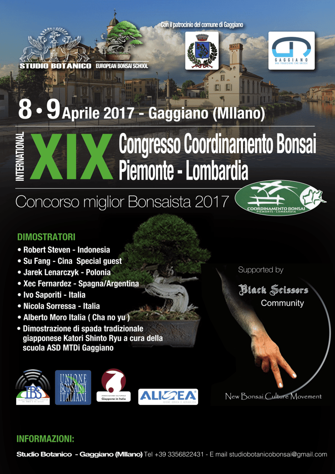 La XIX° Mostra Coordinamento Bonsai Piemonte-Lombardia si terrà a Gaggiano (MI) il prossimo Aprile 2017.