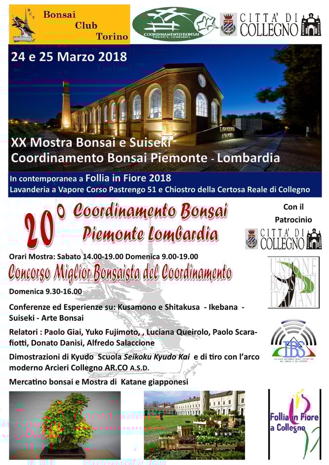 Sabato 24 e domenica 25 marzo 2018 si è tenuta la XXa Mostra Bonsai e Suiseki del Coordinamento Bonsai Piemonte-Lombardia presso la Lavanderia a Vapore in Collegno (TO)