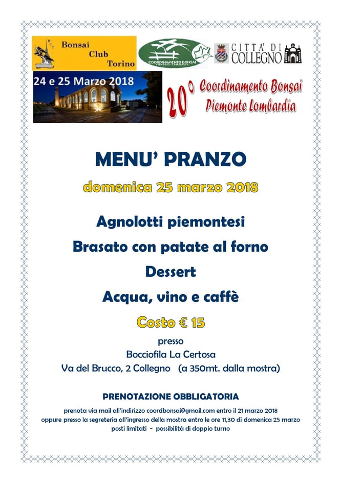 N.B.: Gli ospiti interessati dovranno contattare telefonicamente o via mail l'hotel indicando che saranno presenti alla manifestazione "Bonsai Club Torino" in modo da riconoscere loro la tariffa convenzionata.